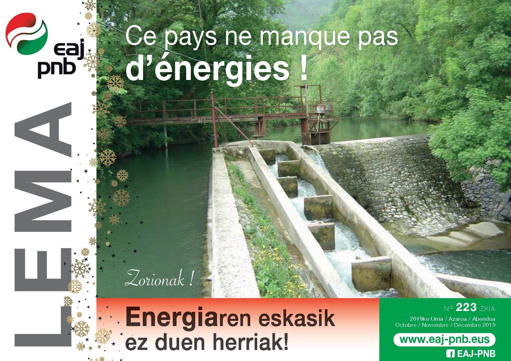 Patxi Bergara, cofondateur d’Enargia, le nouveau fournisseur d’électricité renouvelable et Xavier Cabillon, gérant d’une centrale hydroélectrique, à Banca, deux acteurs et témoins majeurs de cette filière en Pays Basque partagent leurs analyses et leur vision de l’avenir. Ils promeuvent un modèle vertueux de petites unités décentralisées liant efficacité énergétique et emploi local. L’actualité nous conduit à la réforme des retraites, analysée avec pédagogie, par Kauldi Samoreau, chargé des Affaires sociales, au sein de la direction régionale d’EAJ-PNB, en Pays Basque nord. Des rappels historiques, exclusifs à notre revue et deux articles d’opinion sur l’urbanisme et l’architecture nous renvoient à la notion de pays : un territoire avec un héritage patrimonial qui contribue à construire l’avenir, à l’image de ces moulins qui ont pour vocation à devenir des petites centrales hydroélectriques !
